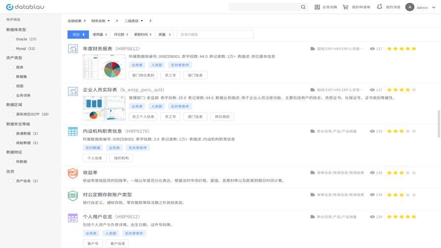 下图是datablau数据资产目录的搜索界面,企业使用时可以根据数据资产的相关性,智能搜索推荐报表、指标、数据标准、物理表/字段等数据,快速得到所需信息。