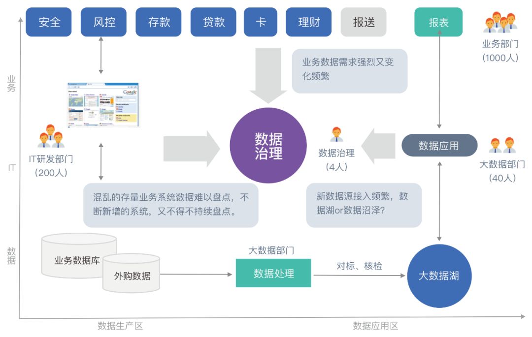 上篇和本篇谈了平衡长期投资和短期收益,架构设计与敏捷数据服务之间的关系。从组织架构上看,这里涉及多部门协作的问题。如下图,我们假设企业里业务部门有1000人,通常IT研发部门有200人,大数据部门40人,而数据治理常常只有4个人。而数据相关的各种问题都指向数据治理部门。业务部门常常抱怨数据需求得不到及时的服务。而IT研发不断升级和上线业务系统导致需要盘点的系统不断增加,形成恶性循环。大数据部门也常常将业务系统的OLTP数据直接拉到数据湖中,没有管控好的数据直接进湖,数据湖就变成了数据沼泽,数据进去就出不来了。