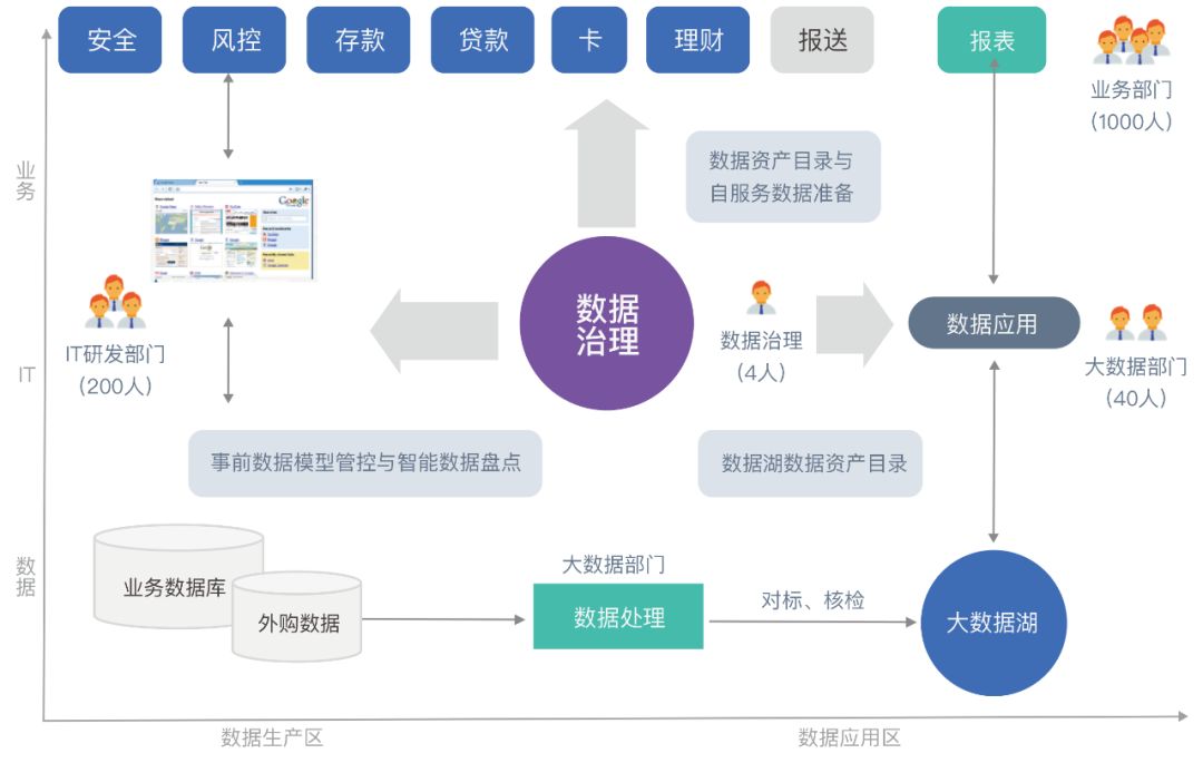 数据治理是多部门协作、众筹的数据治理,不单单是一两个部门的工作。数据治理部门与IT研发部门合作在事前数据模型管控,在源头做数据标准落标,数据生产规范化。与大数据部门合作,发布数据资产目录及数据服务给业务部门。同时鼓励业务部门使用数据资产目录获取数据服务,并提供反馈。形成多部门协作,不断沉淀数据资产的良性生态。
