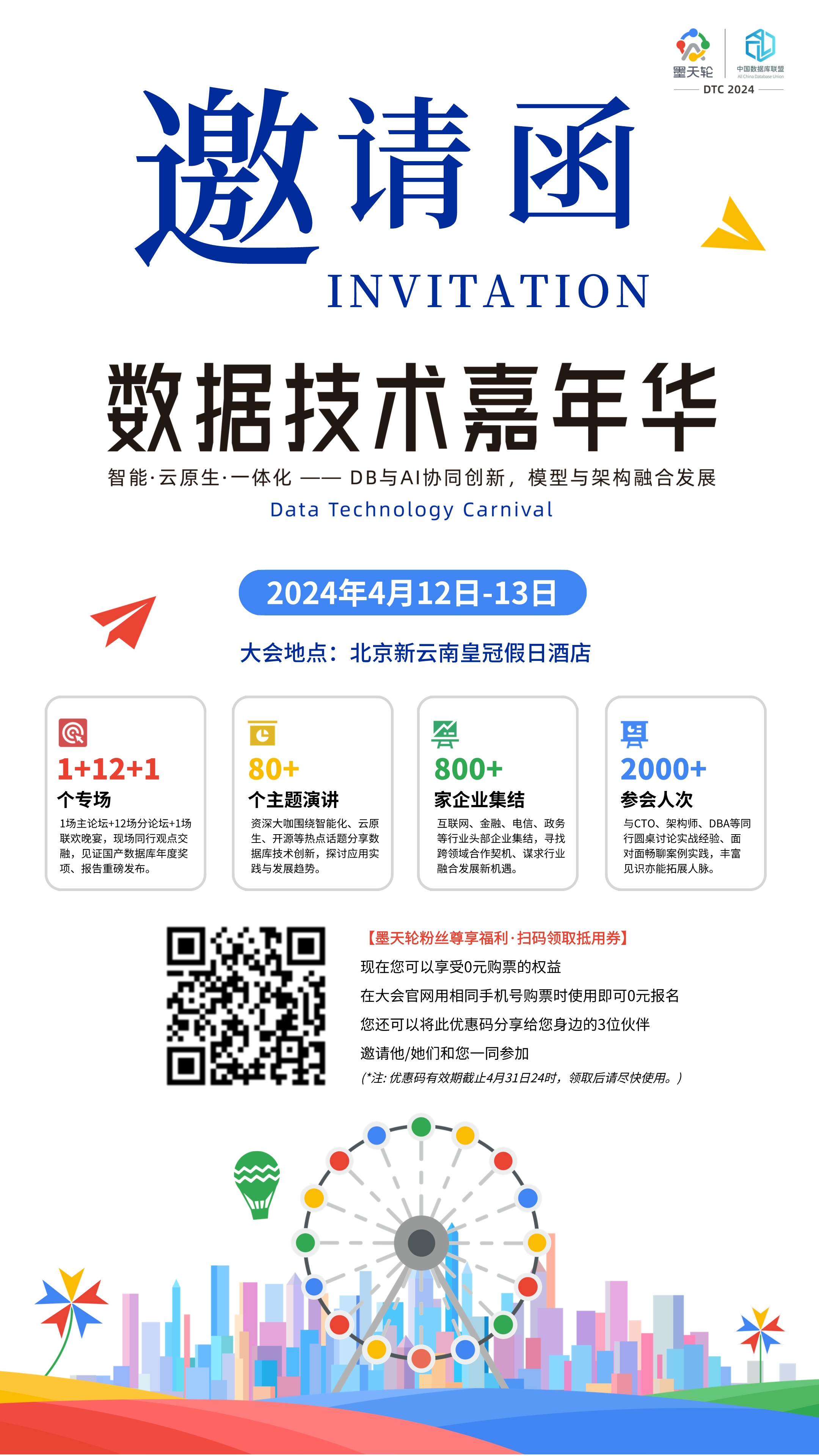 2024年4月12日-13日,由中国DBA联盟(ACDU)和墨天轮社区联合主办的第十三届『数据技术嘉年华』(DTC 2024) 将在北京新云南皇冠假日酒店盛大开启。本次大会以“智能·云原生·一体化——DB与Al协同创新,模型与架构融合发展”为主题,汇聚80余位行业杰出技术领袖、学术精英、行业实践者、生态布道者,分享前沿技术见解、深刻行业洞察、创新实践案例,为广大从业者带来一场数据技术的盛宴。