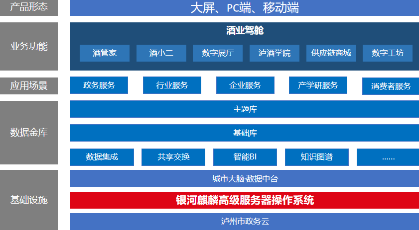 作为白酒行业数字化转型的“先行者”,泸州市自2022年启动了全国首个白酒全产业链数字化综合服务平台建设。在这过程中,麒麟软件打造了以银河麒麟操作系统为底座的定制化的数字化解决方案,助力泸州白酒产业数字化转型升级。