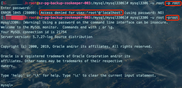 1、-p选项后面跟的是用户密码,-p选项和密码之前是不能有空白字符' '的,会发生不识别的情况,其他选项如-u、-P、-h可以跟空白字符。