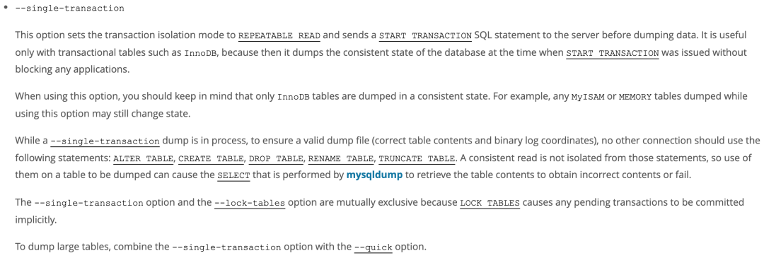 --single-transaction:https://dev.mysql.com/doc/refman/5.7/en/mysqldump.html#option_mysqldump_single-transaction(官档描述)