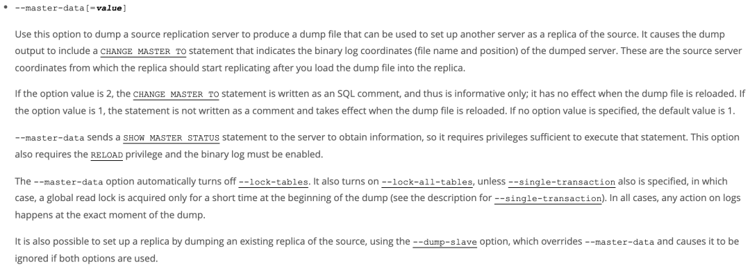 --master-data:https://dev.mysql.com/doc/refman/5.7/en/mysqldump.html#option_mysqldump_master-data(官档描述)