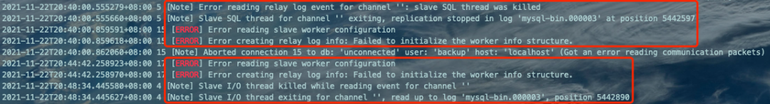 stop slave sql_thread;触发提示:[Note] Error reading relay log event for channel '': slave SQL thread was killedstart slave sql_thread;触发报错:[ERROR] Error reading slave worker configuration[ERROR] Error creating relay log info: Failed to initialize the worker info structure.