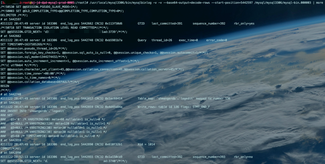 /usr/local/mysql3306/bin/mysqlbinlog -v -v --base64-output=decode-rows --start-position=5442597 /mysql/mysql3306/mysql-bin.000003 | more