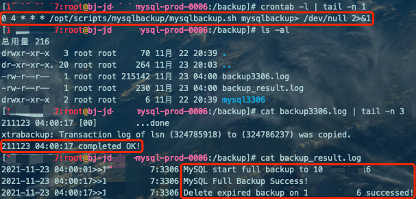 crontab -l | tail -n 1cat backup3306.log | tail -n 3cat backup_result.log