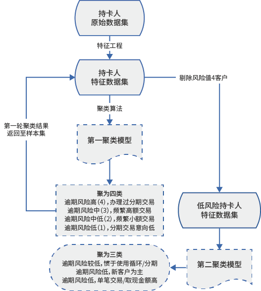 通过样本数据对客户进行风险分群,将客户划分为高风险不宜运营、低风险可运营两类,进而对低风险客户再进行聚类,以便产生特色鲜明的多个小类别,方便银行根据客户群的特点制定针对性的运营策略: