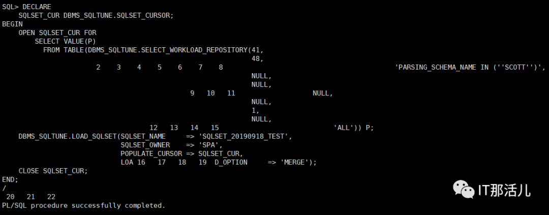 BEGINDBMS_SQLTUNE.CREATE_SQLSET(SQLSET_NAME => ' SQLSET_20190918_TEST',DESCRIPTION => 'SQL Set',SQLSET_OWNER => 'SPA');END;/