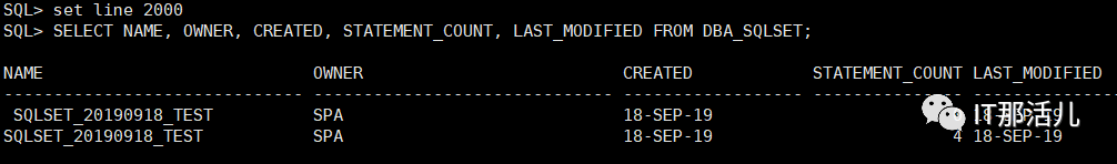 SELECT NAME, OWNER, CREATED, STATEMENT_COUNT, LAST_MODIFIEDFROM DBA_SQLSET;