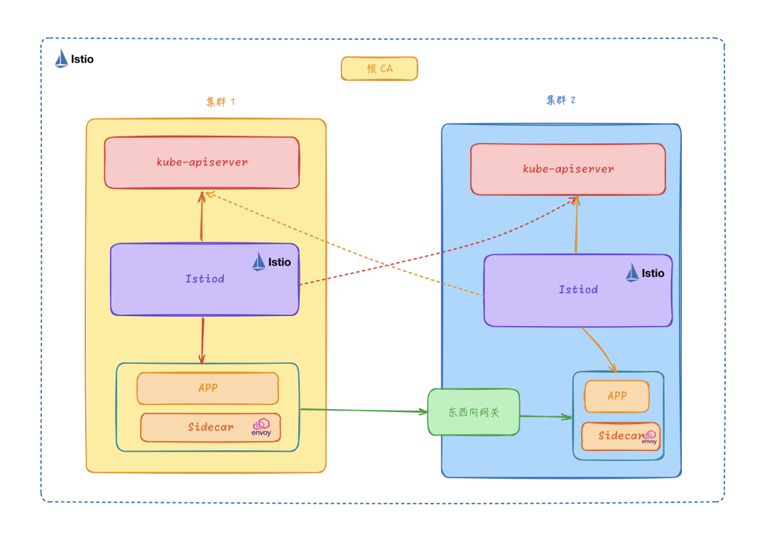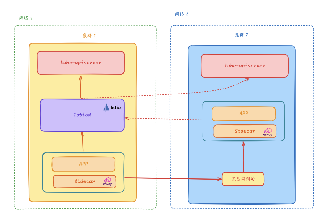 在很多场景下我们多个集群并不在同一个网络中,为满足这个场景 Istio 又提出了一种更加灵活的网络方案,即非扁平网络。在非扁平网络中,我们可以通过配置东西向网关来转发跨集群的访问流量。和扁平网络的方案一样,Istio 控制面一样需要连接所有 Kubernetes 集群的 kube-apiserver,订阅所有集群的 Service、Endpoint 等资源,所有集群的 Envoy Sidecar 都被连接到同一控制平面。