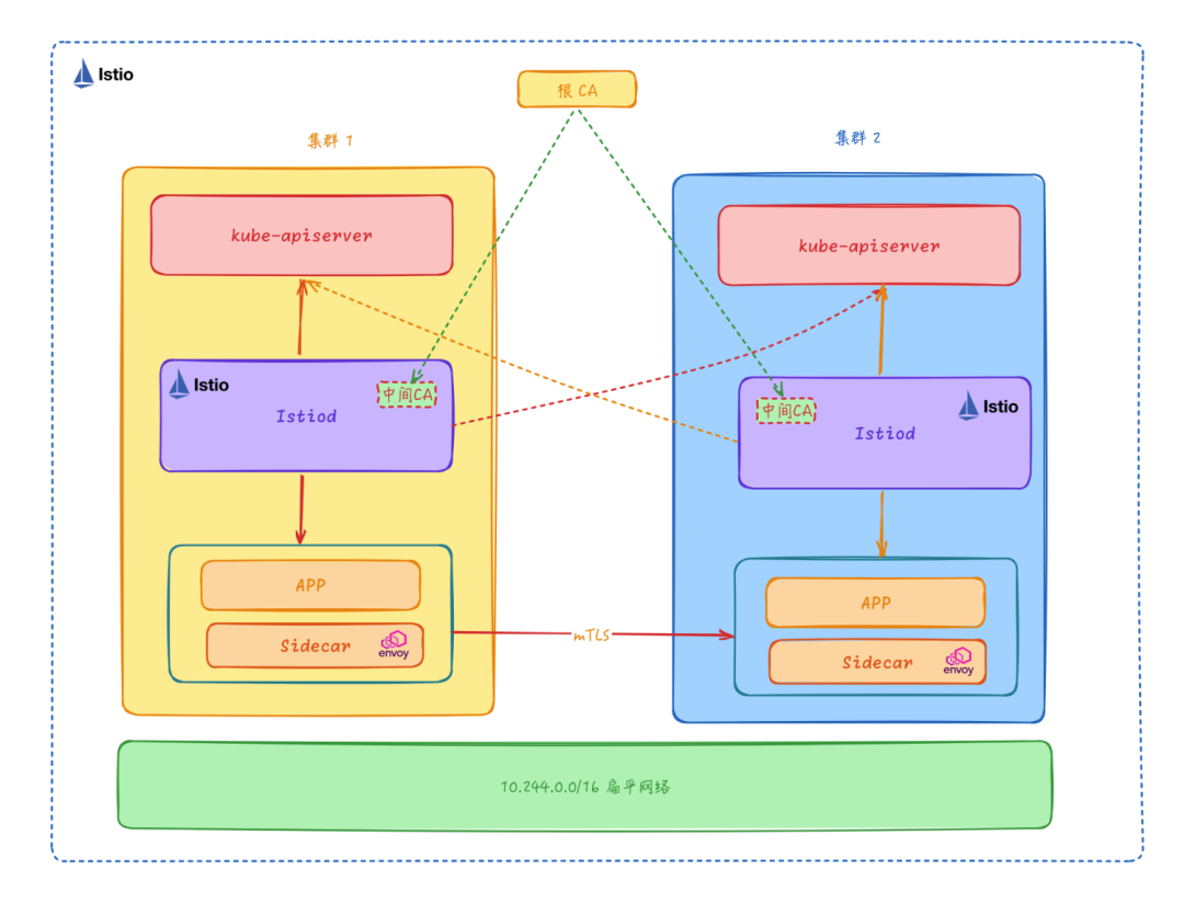 共享根 CA:为了支持跨集群的 mTLS 通信,多控制面模型要求每个集群的控制面 Istiod 都是有相同 CA 机构颁发的中间 CA 证书,供 Citadel 签发证书使用,以支持跨集群的 TLS 双向认证通信。 Sidecar 与本集群的 Istiod 控制面连接订阅 xDS,xDS 通信的可靠性相对更高。 与单控制面模型相比,多控制面模型的控制面性能和可用性更好,适合大规模集群。