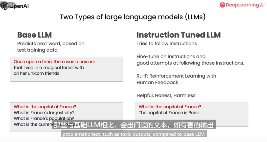 上图展示了两种大型语言模型(LLMs)的对比:基础语言模型(Base LLM)和指令调整语言模型(Instruction Tuned LLM)。