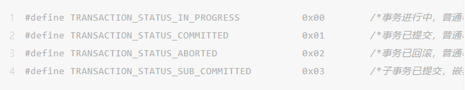 CLOG中只记录四种事务状态,分别是IN_PROGRESS(进行中),CMMITTED(已提交),ABORTED(回滚,中断)以及SUB_COMMITTED(子事务已提交)。