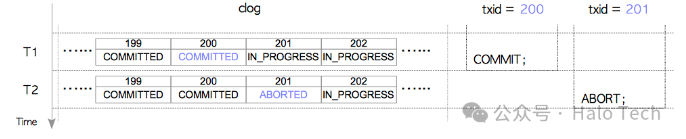 T2:txid 201 回滚或中止;txid 201的状态就从IN_PROGRESS状态变为了ABORTED状态。