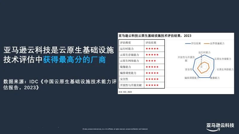 在这个背景下,亚马逊云科技凭借其卓越的技术实力和创新精神,成为云原生基础设施领域的佼佼者,在云原生基础设施技术评估中获得最多满分(数据来源:IDC《中国云原生基础设施技术能力评估报告,2023》1)。