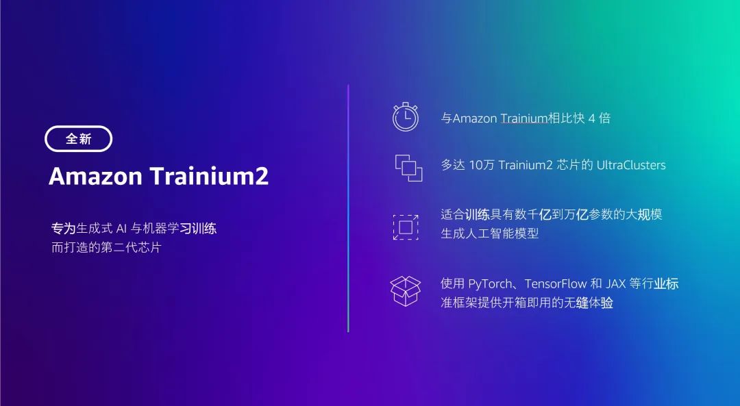全新一代 Trainium2 芯片为拥有数千亿甚至数万亿个参数的基础模型训练做了优化,性能比上一代芯片提高到4倍,拥有65 EFlops 可以按需提供性能支持。明星生成式 AI 企业 Anthropic 计划用 Trainium2 芯片来训练他们的下一代复杂 Claude 模型。