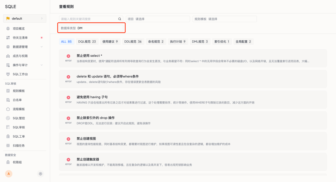 SQLE 是一款全方位的 SQL 质量管理平台,覆盖开发至生产环境的 SQL 审核和管理。支持主流的开源、商业、国产数据库,为开发和运维提供流程自动化能力,提升上线效率,提高数据质量。