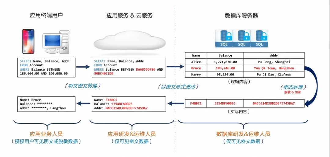 数据库专家继续介绍:“全密态能力指的是数据全生命周期以密态存在。数据一旦流出可信环境,就总是处于密文状态下的。只有当数据落入正确的人手里,例如数据到达咱们的业务系统客户侧,才会被解密。任何账号通过直连数据库的形式,都是无法读取数据明文的。”小王问:“我们现在用的是阿里云的PolarDB MySQL产品。这个产品,支持全密态功能吗?”数据库专家:“全密态能力在阿里云瑶池数据库旗下的云数据库RDS MySQL版、云数据库RDS PostgreSQL版、云原生数据库PolarDB MySQL版、云原生数据库PolarDB PostgreSQL版上都有。你们使用的PolarDB MySQL,全密态能力可以看一看这里全密态PolarMySQL[2]。”小王问:“我们之前这边考虑过,如果加密数据再存入数据库的话,是会对数据库本身功能有影响的。你们这个方案,支持的SQL有什么限制呢?”数据库专家:“完全没有限制!我们支持所有的MySQL语法。我们的秘诀是,数据库内部数据是以明文形式存在的,我们在输出结果时针对计算结果进行加密,MySQL的引擎本身没有受到任何的影响,所以在稳定性上、性能上的影响也微乎其微。”小王问:“那么什么叫做让数据落入正确的人手中呢?产研、运维人员是不是正确的人呢?”数据库专家:“请看图。对于应用终端用户来说,他们是数据的真正所有者,可以看到明文或者是脱敏后的敏感数据。对于应用研发、运维人员以及数据库研发、运维人员来说,他们都只能看到加密后的数据,监守自盗的问题不复存在。”