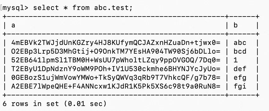 数据库专家继续说:“并且,咱们的数据库通过用户自定义敏感规则[3]的方式,来标记需要加密的数据。在业务侧,您可以根据自己的业务需求,将数据库内比较敏感的身份证号、地址、用户手机号等数据进行加密。同时,考虑到企业用户往往会给DBA、产研人员一定的阿里云控制台权限,定义规则这个行为本身可以通过阿里云的RAM体系[4]来约束。企业可以根据最小授信原则给DBA、产研人员授权,避免他们恶意篡改规则,以明文形式导出数据。”“您看,在配置加密规则之后,咱们直接用MySQL客户端连接数据库查询,看到的敏感数据全都是密文,而非敏感数据仍然是明文。”