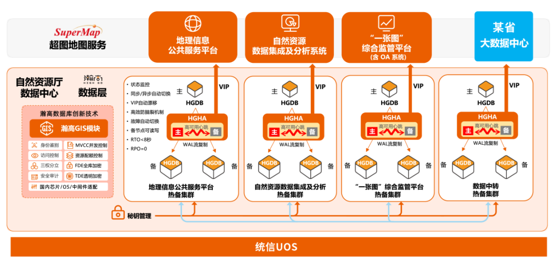 搭载统信UOS服务器版V20,瀚高数据库集群支撑了地理信息公共服务平台、自然资源数据集成及分析系统和“一张图”综合监管平台(含OA系统)等业务系统,另部署一套数据库集群用于数据中转,对接该省大数据中心数据同步和超图地图服务应用。