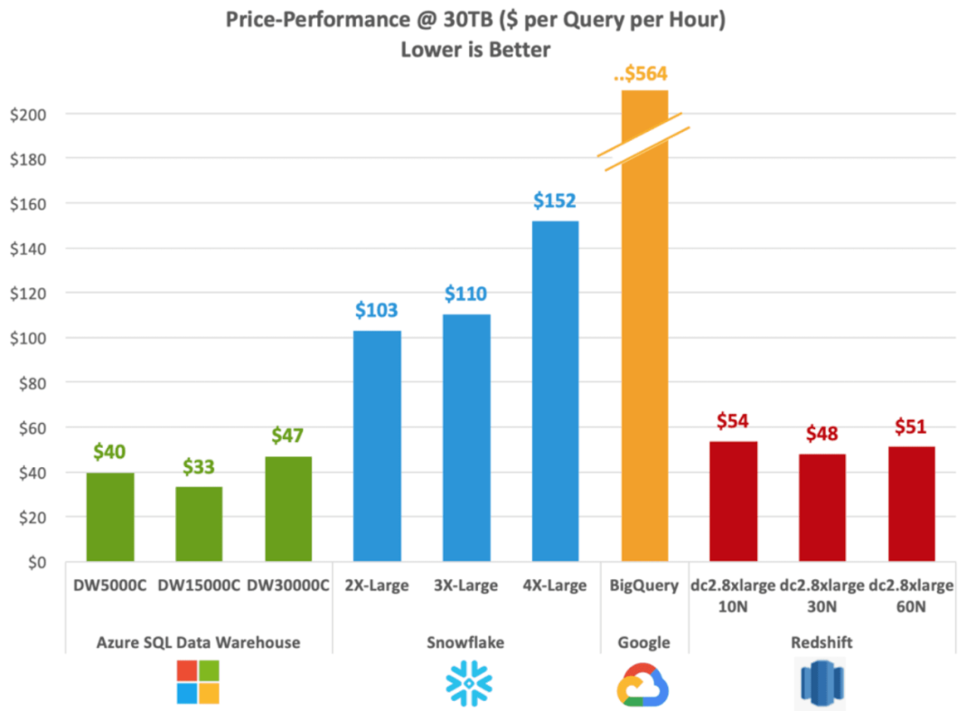 2019 年,GigaOm 发布了一篇云数仓的基准评测报告[2]。他们在三大云服务商外加 Snowflake 上都运行了 TPC-H 和 TPC-DS 测试。结果如何呢?Azure Data Warehouse 最快,Redshift 紧随其后,Snowflake 和 BigQuery 远远落后。
