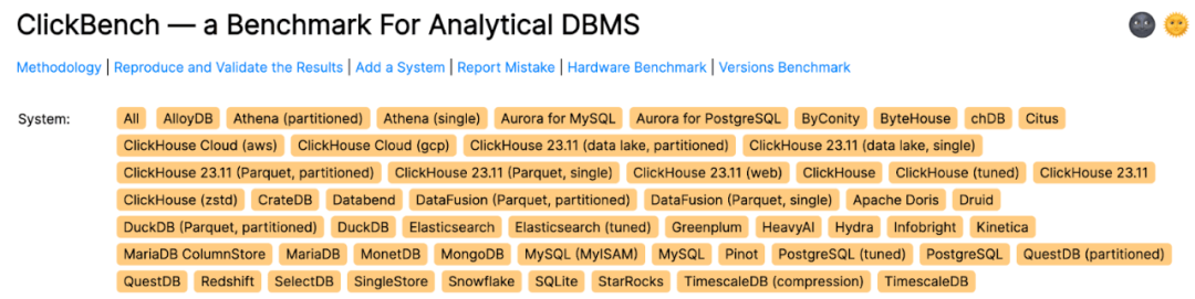 虽然你可能觉得发布一个只执行单表扫描的基准测试很俗气,但 Clickbench 实际上在展示许多实际工作负载方面做得很好。如果你进行了大量的日志分析,并且需要计算网站的不同用户,这可能是个很好的性能指标。也就是说,如果你使用星型模型运行更传统的数据仓库工作负载,那么 Clickbench 会产生误导。