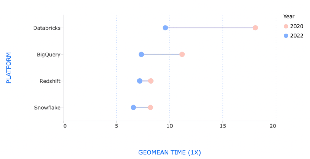 Fivetran CEO George Fraser 写过一篇很有意思的文章[7],比较了主要数据仓库厂商的性能在一段时间内的表现;虽然 2020 年各厂商的性能表现存在很大差异,但到 2022 年,它们之间的差异已经大大缩小。2020 年,最快的时间是 8 秒,最慢的是 18 秒;而 2022 年,其中 3 家厂商的时间都在 7 秒左右,最慢的也有 9 秒。