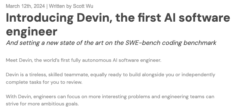 又是让程序员们兴奋而焦绿的一刻,昨天业界又发布了一款 AI 编程产品 Devin。号称是业界第一个 AI 软件工程师。作者 Scott Wu 曾是国际信息奥赛 (IOI) 连续三届的金牌得主,其中还有一届是满分。