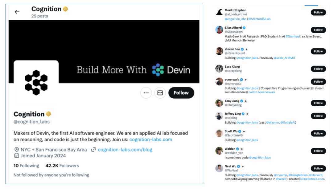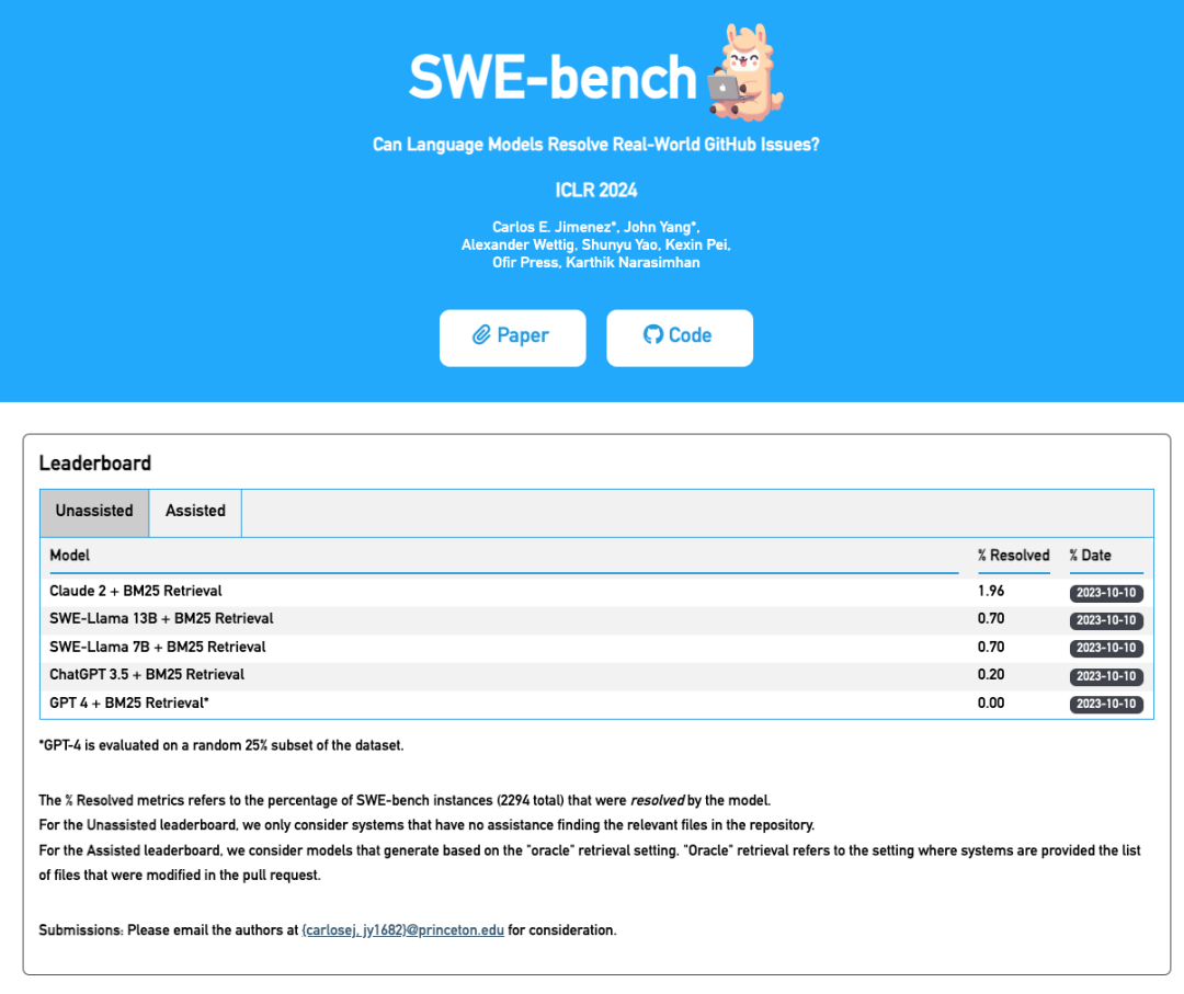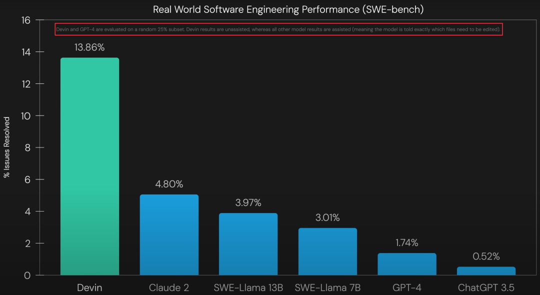 Devin 背后的公司名字叫 Cognition。中文翻译就是认知,很契合。发布了不到 24 小时,推上就有了 4 万多粉丝。官号关注的 10 个人,看上去应该都是公司的员工,MIT,Stanford,Harvard,Google Brain。时代最优秀的大脑们,终于不再去思考如何让人们点击广告了。Devin 官网也放出了和其他 LLM 大模型在 SWE-bench 下的表现对比。SWE-bench 收录的是 GitHub 上真实的问题。之前在没有辅助的情况下,表现最好的 Claude 2 也只有 1.96% 的完成度。即使在有辅助的情况下,表现最好的 Claude 2 也只有 4.8 %。