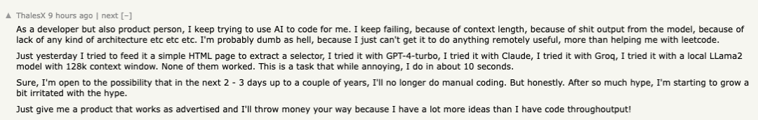 质疑派。又来一个画饼的!就在昨天,我想尝试从一个简单的网页里提取选择器,我试了 GPT-4-turbo,我试了 Claude,我试了 Groq,我试了本地的 LLama2,结果没一个能用的!我自己干 10 秒钟就搞定了!我已经被你们这些编程 AI 伤够了!(是不是还是氪金不够?说不定用 GPT-4 或者 Claude 2 就行了呢,甚至 Claude 3?)