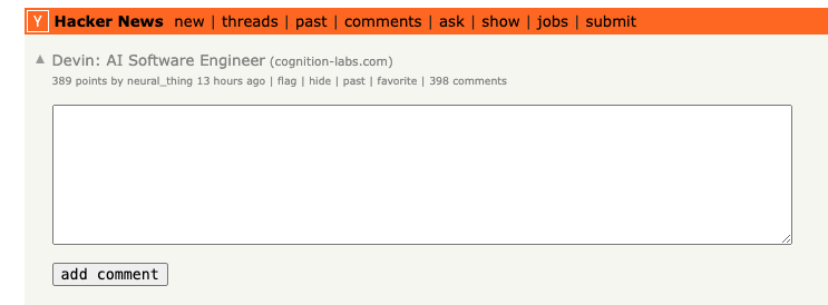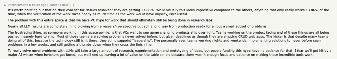 而 Devin 在没有辅助的情况下,一下子就把完成度提高到了 13.86 %。从 1.96% 到 13.86%,从相对提升来说惊人,但从绝对值来说,仍然略显寒酸。虽然 Devin 是随机取样了 25% 的数据进行测试,但作为一款专门针对编程场景的 AI,想必是针对 GitHub 数据进行了训练,那是否会有过拟合 overfitting 的问题,使得在基于 GitHub 数据的测试集上表现优秀?网友们也纷纷表达观点: