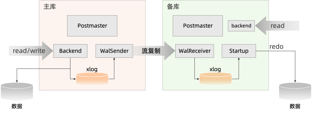 主库WalSender线程从磁盘上读取还未发送的xlog到内存,并发送给备库的WalReceiver线程