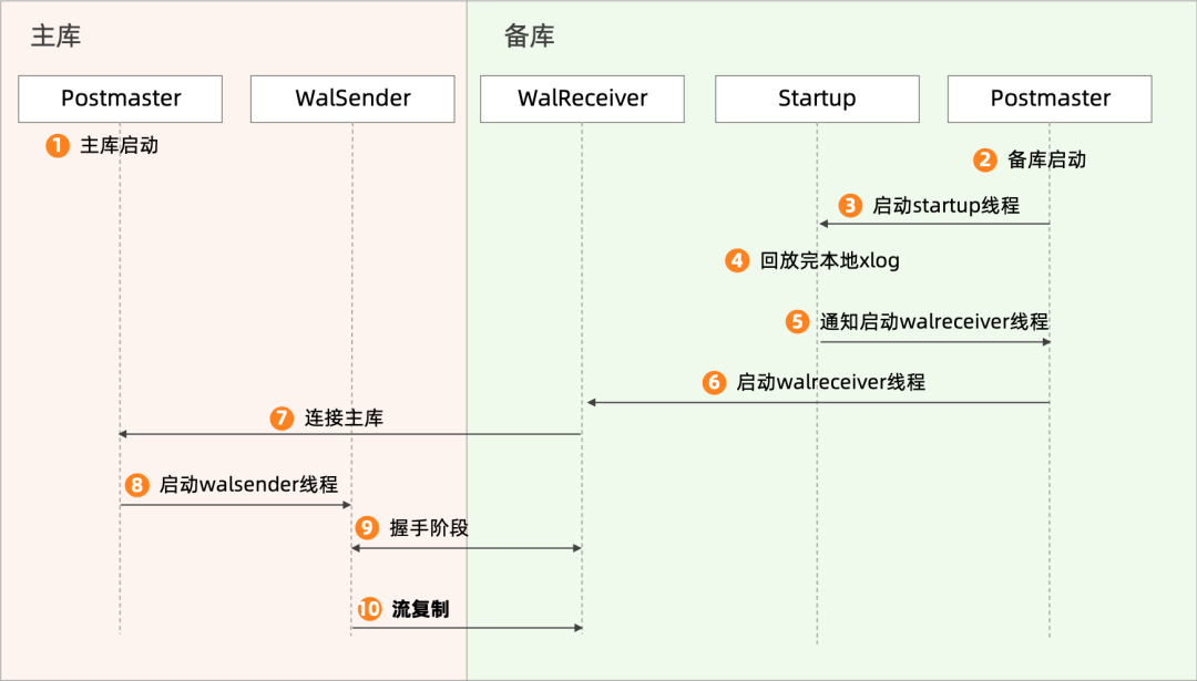 备库Startup线程设置流复制起点、主库连接信息、复制槽名称等信息,并通知Postmaster线程启动WalReceiver线程