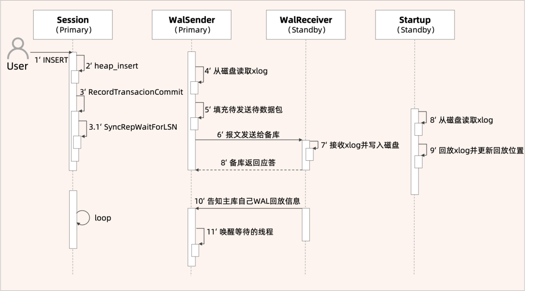 开启同步流复制后,主库事务的提交需等待相应备库接收、写入、落盘或回放到对应xlog位置后才能向客户端返回成功,相关流程如下图所示: