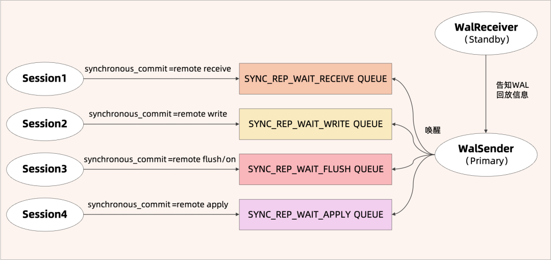 备库的WalReceiver线程会告知主库的WalSender线程当前xlog的接收、写入、落盘以及回放的位置,当其超过某个事务提交时产生的最后一条xlog日志的位置时,主库的WalSender线程便可以将对应的后端线程唤醒,反馈给客户端。