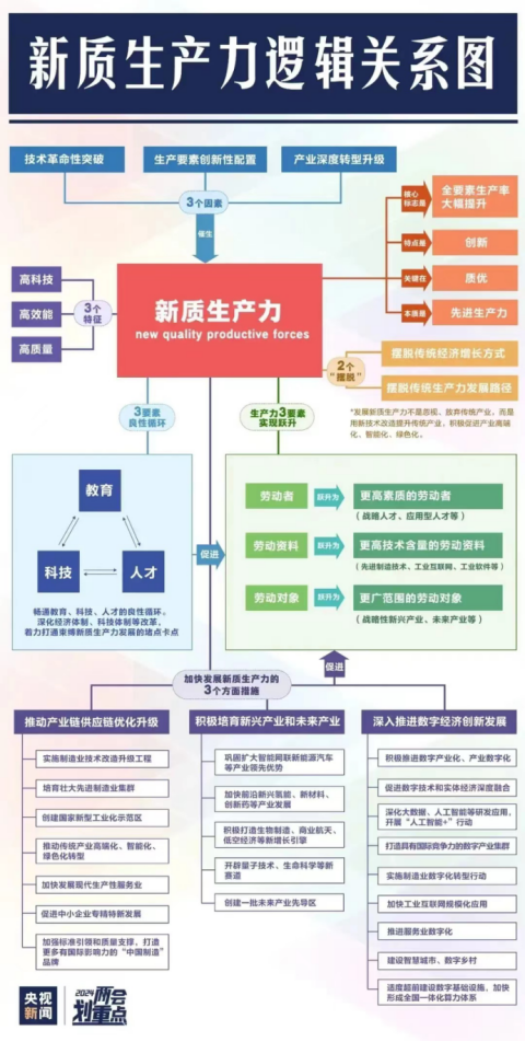 其中,新质生产力是未来政策重点。2024年政府工作报告部署全年十大任务,将“大力推进现代化产业体系建设,加快发展新质生产力”放到首位。