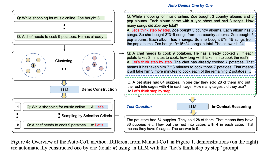 Auto-CoT通过多样化采样增强了鲁棒性,以应对个别生成的推理链可能存在的错误。它对各种问题进行采样,并为每个问题生成多个不同的推理链,形成最终的示范集。