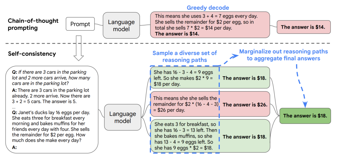 通过少样本CoT采样多个不同的推理路径,并使用生成结果选择最一致的答案。这有助于提高CoT提示在涉及算术和常识推理的任务中的性能。