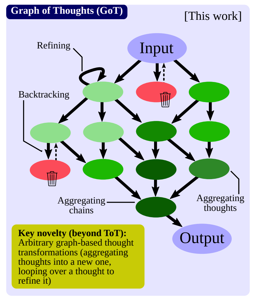 Graph of Thoughts (GoT) 是一个基于图的框架,推动了传统的顺序方法以更好地与人类思维的非线性特征相吻合。Graph of Thoughts (GoT) 框架允许动态的相互作用、回溯和思路评估,允许从各个分支聚合和组合思路,摆脱了树状思路的线性结构。该框架的关键贡献包括将推理过程建模为一个有向图,并提供具有多种转换操作的模块化架构。