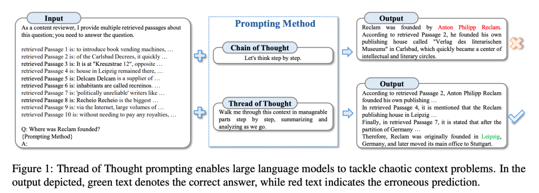 Thread of Thought (ThoT)是一种旨在增强LLMs在混乱环境中推理能力的提示技术。ThoT受人类认知启发,将广泛的上下文系统地划分为可管理的片段进行递增式分析,采用两阶段方法,LLM首先对每个片段进行总结和检查,然后对信息进行进一步优化以得出最终的响应。