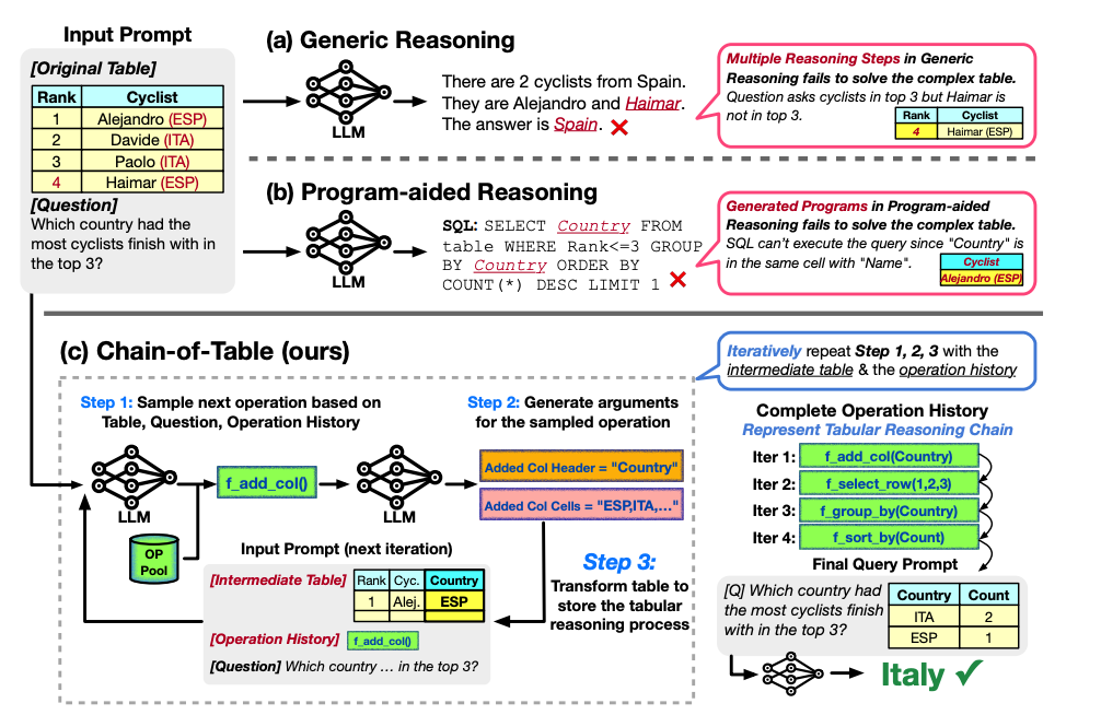 Chain-of-Table通过在表格上动态生成和执行常见的SQL/DataFrame操作,使用逐步的表格推理来处理表格场景。这个过程的迭代性增强了中间结果,使LLMs能够通过逻辑可视化的推理链进行预测。