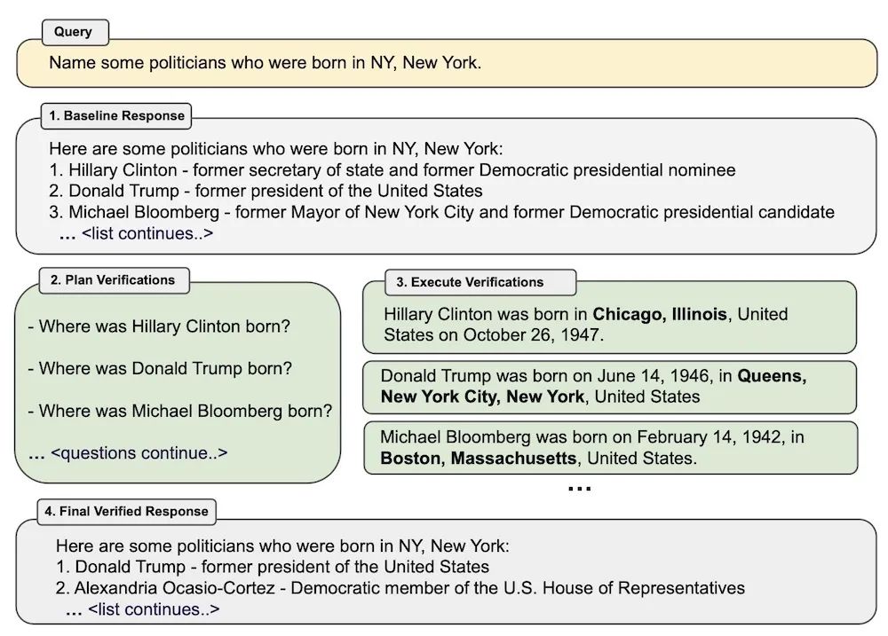 Chain-of-Verification (CoVe)包括一个系统的四步过程,包括模型生成基准响应,规划验证问题以检查其工作,独立回答这些问题,并生成包含验证的修订响应。通过通过这种有意识的多步骤方法验证其工作,LLM增强了逻辑推理能力,即使在存在矛盾信息的情况下也能减少错误。