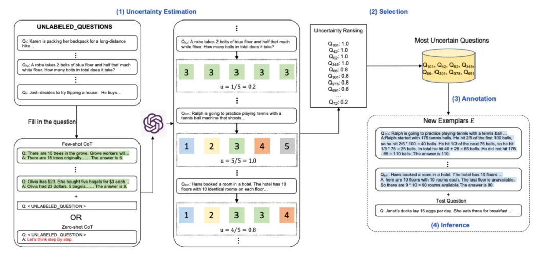 Active-Prompt引入了一种确定对注释最具影响力问题的机制。该方法借鉴了基于不确定性的主动学习,利用各种度量标准来描述不确定性,并选择最不确定的问题进行注释。