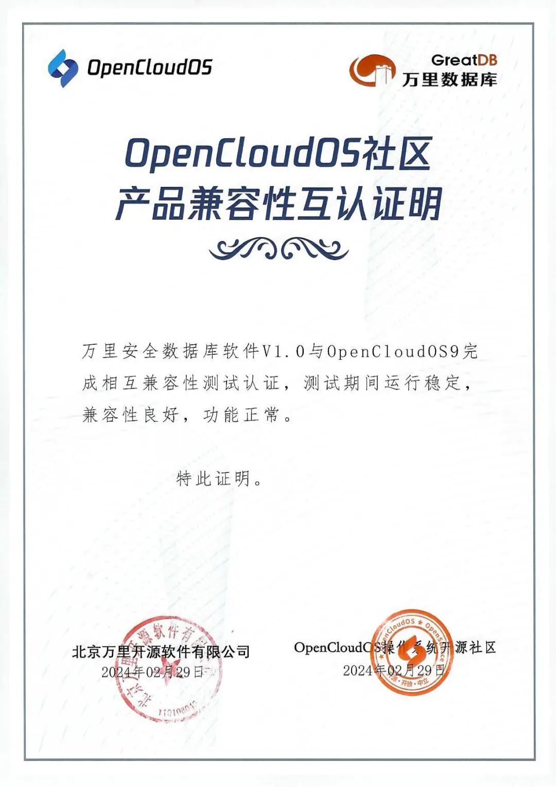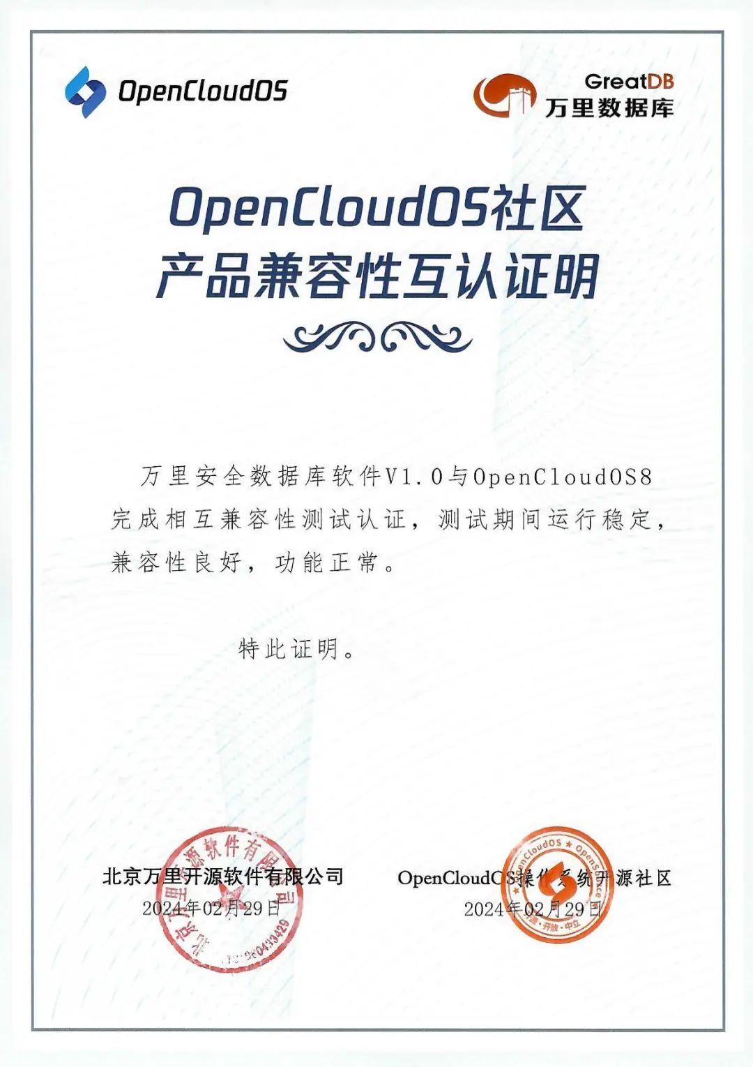 在此背景下,近日,北京万里开源软件有限公司的核心数据库产品万里安全数据库软件GreatDB分别与腾讯开源操作系统 OpenCloudOS 8和 OpenCloudOS 9两款产品完成兼容互认证。