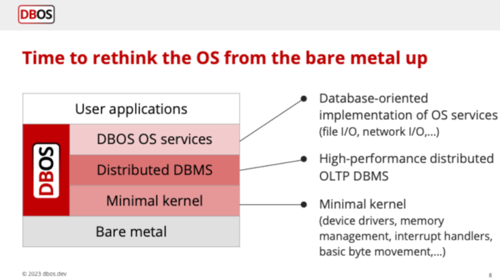 在DBOS设计中,高性能分布式OLTP将实现一套操作系统服务。它将在最小的操作系统内核上运行,支持内存管理、设备驱动程序、中断处理程序和字节管理的基本任务。