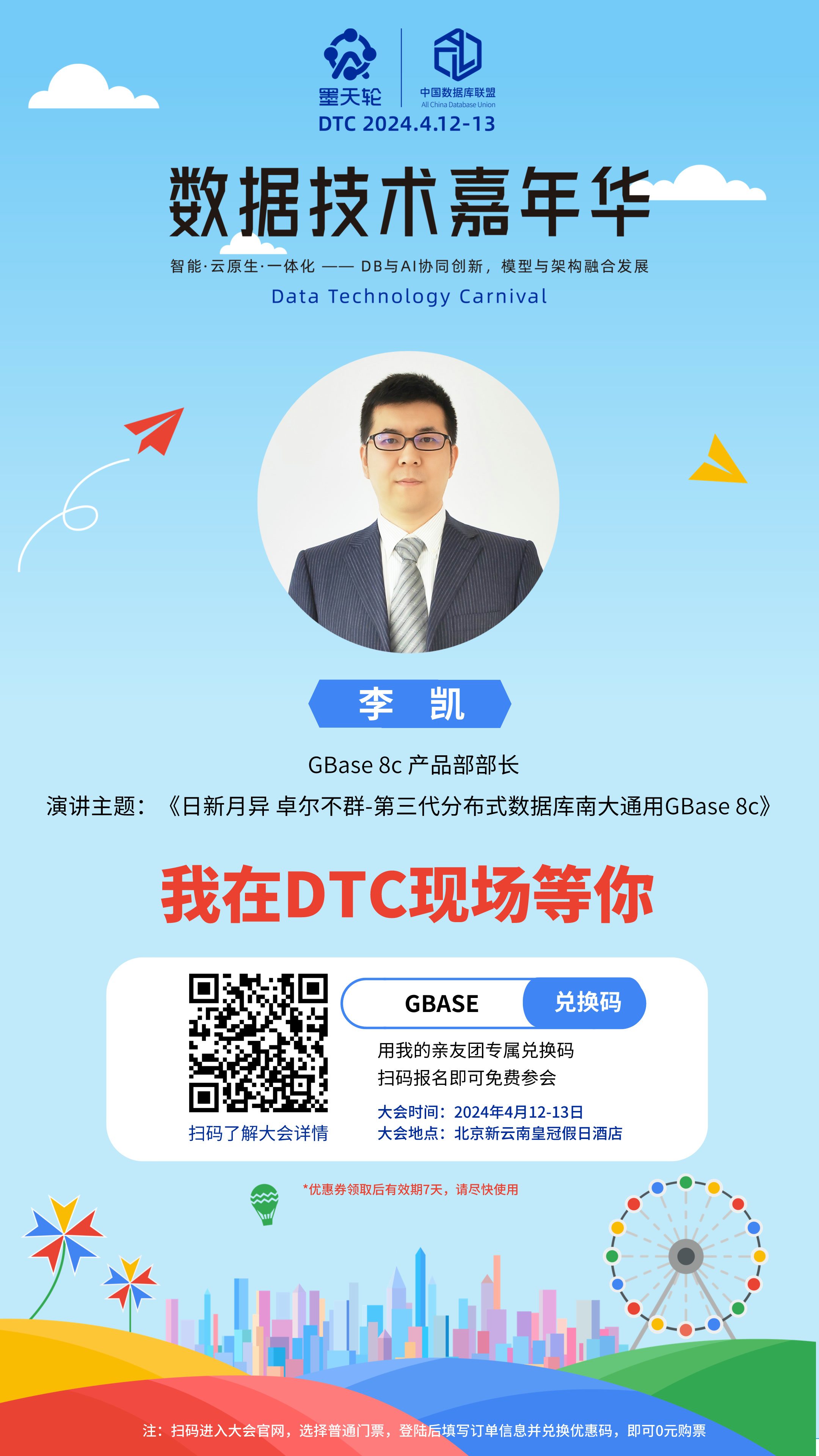 2024年4月12日,由中国 DBA 联盟(ACDU)和墨天轮社区联合主办的第十三届 『数据技术嘉年华』 将在北京新云南皇冠假日酒店盛大开启。本届DTC2024,GBASE南大通用8c产品经理李凯将带来《日新月异 卓尔不群——第三代分布式数据库南大通用GBase 8c》的主题分享,回顾分布式数据库走入大众视野以来,在适用场景、体系架构、主要特点等方面的发展与演进,并着重分享南大通用定位于第三代分布式数据库的产品——多模多态数据库GBase 8c的核心特性、关键技术与最佳实践。让我们期待 DTC2024 盛会,一起见证GBASE南大通用的精彩分享,探索数据技术的未来之路。