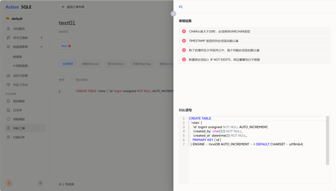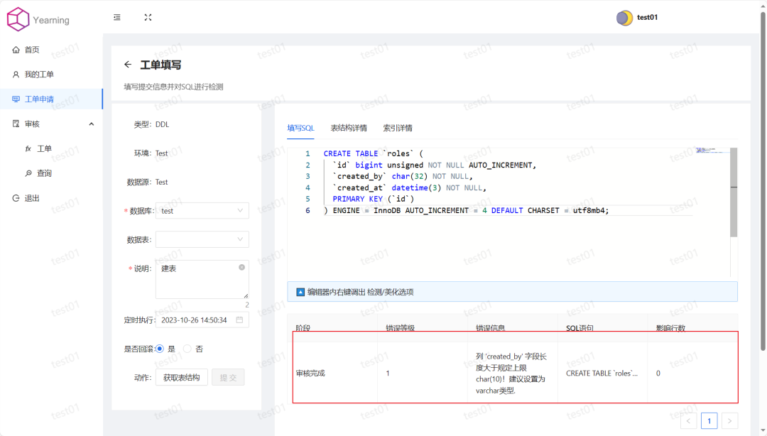 如下图的建表 SQL,Yearning 给出的审核结果有 char 类型改 varchar,而 SQLE 的审核结果更为丰富。