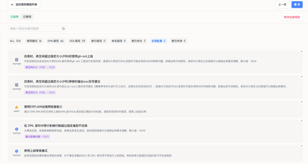 | 规则审核 | 700+ 条,DDL、DML、索引规范等划分清晰 | 45 条,集中在一个列表 |