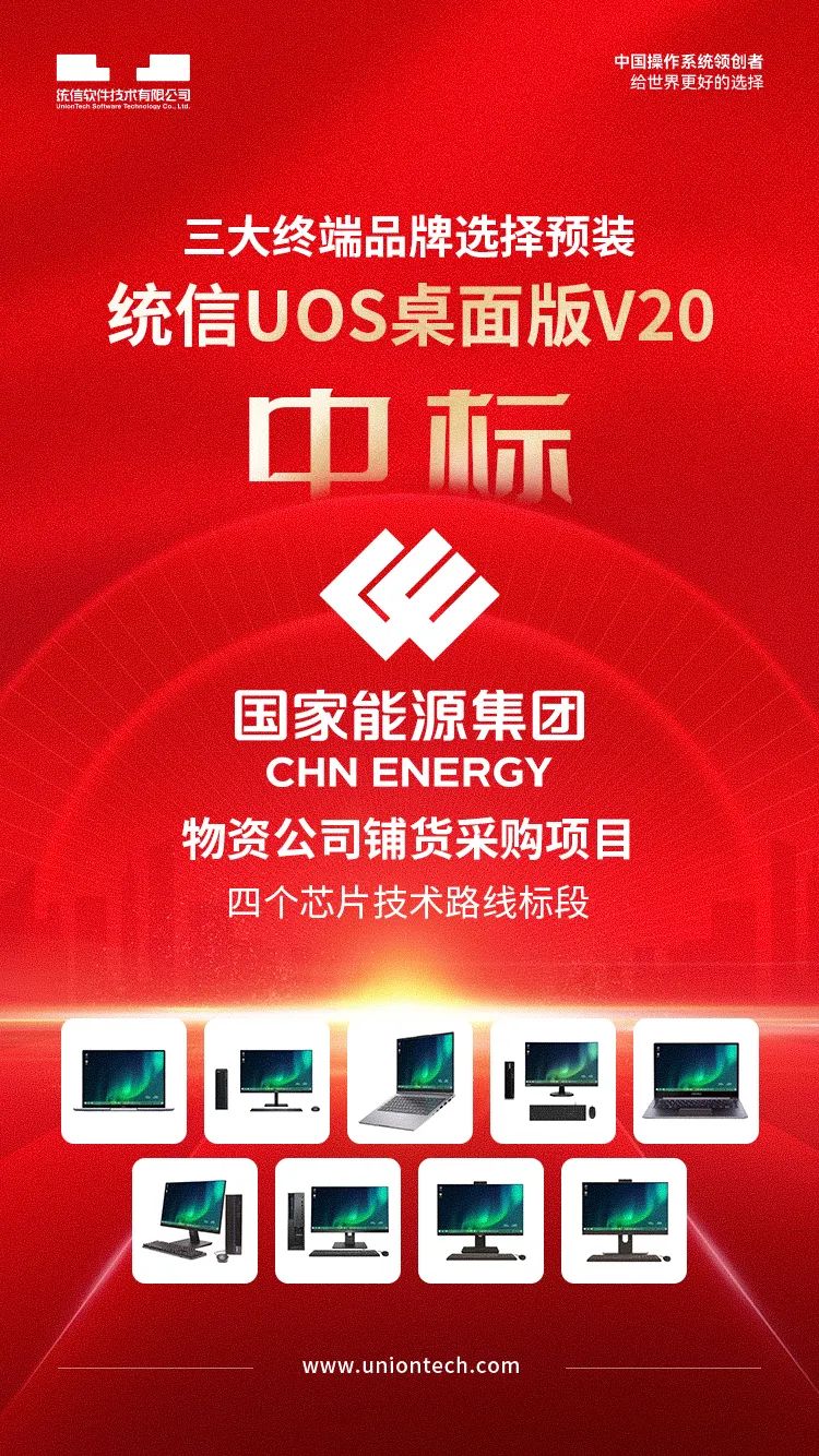 本次招标分为麒麟、海光、飞腾、兆芯、龙芯五个芯片技术路线进行,要求终端厂商预装操作系统进行应标。凭借优异的产品性能、高水平的生态持续兼容能力和强大的服务保障,参与应标的国内主流国产办公终端厂商均选择与统信软件携手共同服务客户,预装统信UOS桌面版V20的9款产品均已上架国能e购商城。